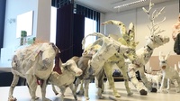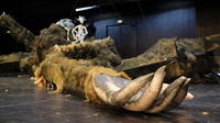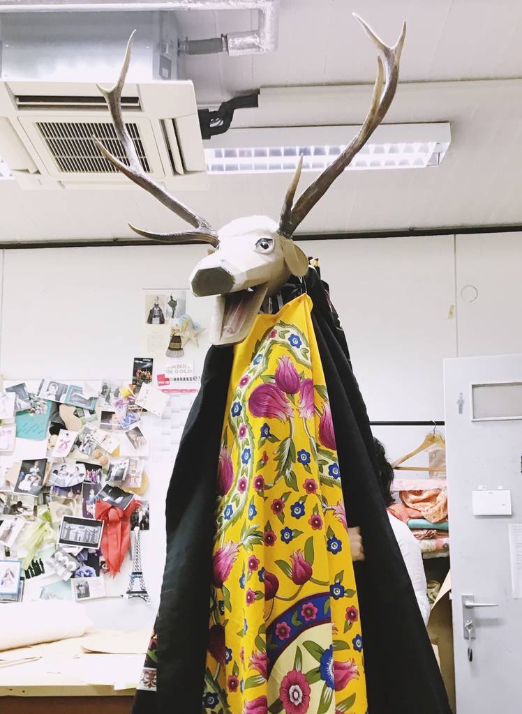 Die Abteilung Requisite kann auf keinerlei Vorerfahrung mit Puppen zurückgreifen: "Wir tasten uns da so langsam ran. Wir haben von der Bühnenbildnerin für das Reh ein kleines Bild in DIN A5 als Figurine bekommen. Demnach haben wir das gebaut. Das Geweih haben wir aus dem Fundus, den Kopf haben wir so leicht wie möglich gebaut, beim Gestell hat die Schlosserei fürs Schweißen ausgeholfen. Das ist dann so ein kleiner Entwicklungsprozess wie das ja oft ist auch bei Requisiten, die so ein bisschen erfunden werden müssen erst mal."