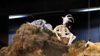 Stefanie Oberhoff: Ich komme mehr aus der Figurentheater als aus der Operntheaterwelt. Für mich sind die Opernsänger die Herausforderung [lacht]. Für mich ist das Figurenthater auch in meiner eigenen Arbeit nicht definiert, sondern immer ein Experiment mit neue Formen. Wie auch das [zeigt auf die Großpuppe] ist jetzt unbedingt nicht das, was sich jeder unter einer Puppe vorstellt, das ist vielleicht ein bisschen größer. So sind auch die Kostüme eigentlich auch Puppen, sie sind angelehnt an die schwäbisch-allemannische Fasnet und sind Tiergestalten und sind dadurch in ihren Bewegungen auch irgendwie entmenschlicht. Gerade das was gesehen haben, das Reh, das sich sehr puppig bewegt nachher. Da werden die Puppenspieler*innen selber zu Puppen gemacht, was ist für mich auch in dem Ausmaß relativ neu ist.