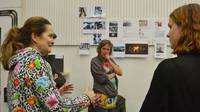 Hier probieren die zwei Puppenspielerinnen aus, wie sich die Puppen aus Zeitungspapier und Klebeband auf der Bühne bewegen können.