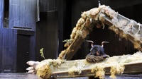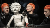 Das stimmt. Aber er ist eben auch nur so groß, weil die Menschen ihn Großwerden lassen. Würden nicht fünf Leute stehen und ihn formen, verlebendigen und im wahrsten Sinne des Wortes hochhalten, wäre er auch ganz klein, ja gar nicht existent. Genau für die Übersetzung solcher Machtstrukturen bietet sich das Puppentheater und in dem Fall eine Puppe an, die erst durch das Zutun der Menschen entsteht. Aus Materialien und bestimmten Dingen entsteht eine Figur, ein Popanz, der als Sondermacht fungiert. Darunter kann man natürlich auch das System „Kirche“ allgemein verstehen. So schnell der Papst aufgebaut ist, so schnell zerfällt er auch wieder. [...] Ich glaube, weil dieser Abend so viel Innerlichkeit darstellt und nach außen kehrt, also innere Einstellungen, innere Abgründe, innere Verschlossenheit gegenüber anderen oder gegenüber dem Unheil in der Welt. Da nimmt das Puppentheater genau diese Verschlossenheit und knackt sie und macht dadurch die Eigenschaften sichtbar, die man normalerweise bei so einem Fest vor der Tür lässt. Das Puppentheater ist bei „Jauchzet, frohlocket!“ also immer wieder Störfaktor, der die unbequeme Wahrheit unseres Zusammenlebens und der menschlichen Abgründe auf den Tisch bringt.