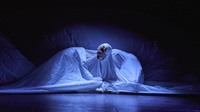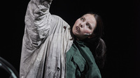 Annette Dabs: Als wir davon erfahren haben, das war ja relativ kurzfristig, war relativ schnell klar, dass wir auf alle Fälle wieder mit dieser Größe arbeiten wollen, also dass das Bühnenbild eigentlich der Protagonist ist und dass es darum geht, das Bühnenbild zu animieren. Also wieder etwas auf die Bühne zu stellen, was Ausmaße haben könnte wie eine Landschaft. Das war schonmal die Grundvoraussetzung, mit der wir gemeinsam begonnen haben. Wir hatten das schon bei „Moondog“, dass wir auch mit einer sehr kleinen Figur gearbeitet haben und ich persönlich fand diesen Wechsel zwischen ganz klein, wo Leute sagten: "Das können die Leute da hinten doch überhaupt gar nicht mehr erkennen!", das fand ich gerade sehr reizvoll. Ich glaube, das hat emotional auch sehr gut funkioniert, weil alle haben diese Puppe gesehen, selbst vom letzten Platz in der letzten Reihe. Und dann auf einmal die Bewegung der großen Puppe. Diesen Unterschied in den Dimensionen, den wollte ich gerne auch wieder haben. Und dann kamst du mit deiner Idee von der "Kamerafahrt ins Herz".